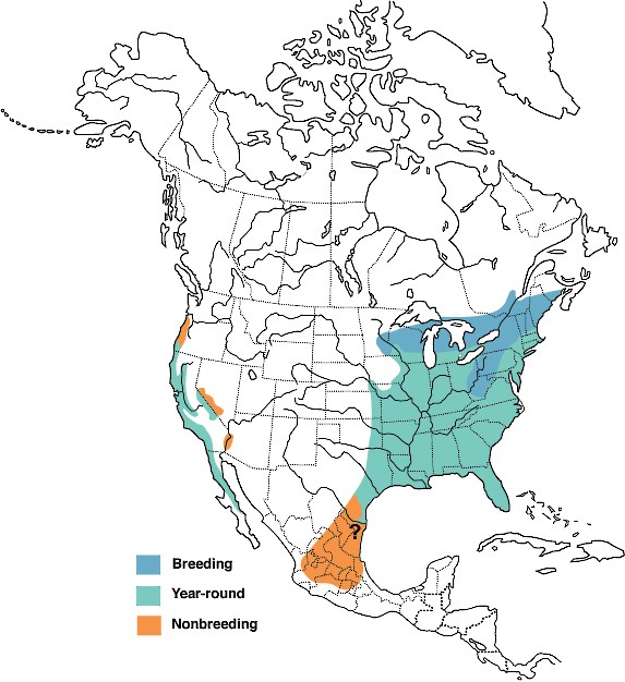 Distinguished by its “red” shoulder patches, black-and-white checkered flight feathers (seen from above), and translucent, crescent-shaped wing panel in the outer primaries (seen from below when the wing is backlit), the Red-shouldered Hawk has been well surveyed at hawk watch locations throughout North America. It is a partial migrant, with only northernmost populations moving south for winter (Figure 1).