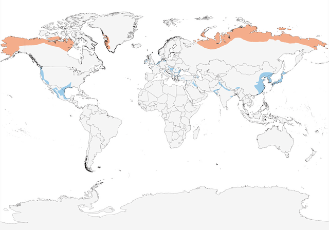 The Greater White-fronted Goose has a nearly circumpolar breeding distribution, the broadest within its genus, nesting in dry tundra, wet tundra, and taiga habitats. Its wintering range is equally broad, ranging south to approximately the Tropic of Cancer in Asia and North America and to approximately 40°N in Europe and the Middle East, favoring semiarid grasslands, wetlands, and agricultural fields during migration and winter. Within this extensive range, there are five subspecies (4, 5): Anser albifrons sponsa and A. a. elegasi in western North America, A. a. gambelli in eastern and central North America, A. a. flavirostris in the North Atlantic, and A. a. albifrons through much of Europe and Asia, the last of which can be split into two to six populations with largely segregated breeding and wintering areas (6, 7). Two of the five subspecies have a somewhat restricted breeding range and relatively small population, with the A. a. elegasi consisting of roughly 10,000 birds that breed only in Alaska's Cook Inlet (8, 9, 10, 11) and A. a. flavirostris consisting of circa 18,800 birds that breed only in coastal western Greenland (12, 11). The most recent estimates place the world population at just over 5,000,000 birds (11). The Eurasian populations have increased at just over 3% per annum since 1988 and North American populations at approximately 5% per year since the mid-1970s (11), with increases attributed to hunting restrictions (13, 14, 7) and increased use of agricultural fields, including corn (15, 16), rice (17, 16, 18), and wheat (15, 16), as well as barley, oats, and potatoes (16).